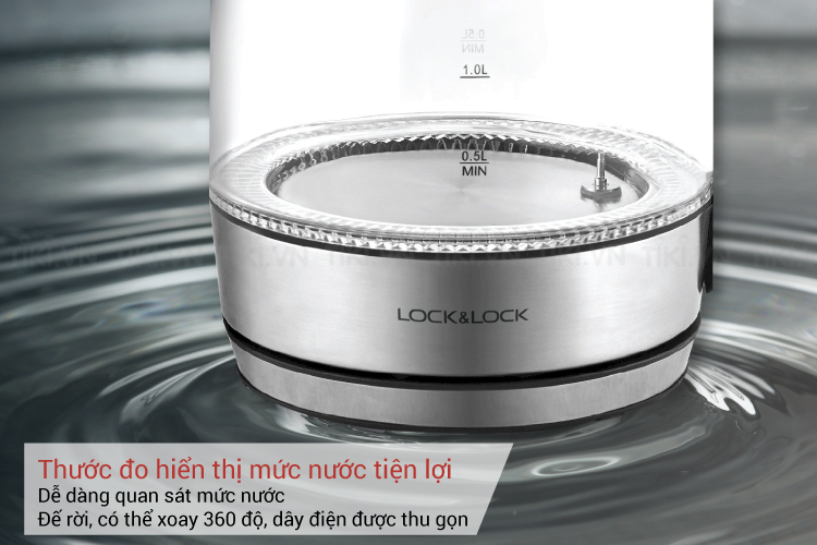 Ấm Điện Thủy Tinh Siêu Tốc Lock&Lock EJK341 có thước đo hiển thị mức nước giúp dễ dàng quan sát mức nước hiện có trong bình chống trào. Ngoài ra, đế có cấu tạo rời, có thể xoay 360 độ cùng với dây điện được thu gọn giúp cho việc cất giữ sản phẩm trở nên dễ dàng hơn bao giờ hết.