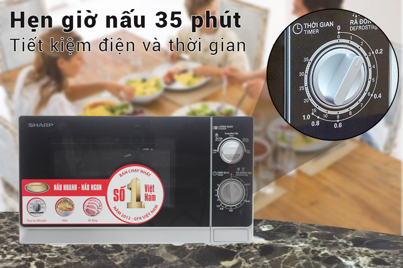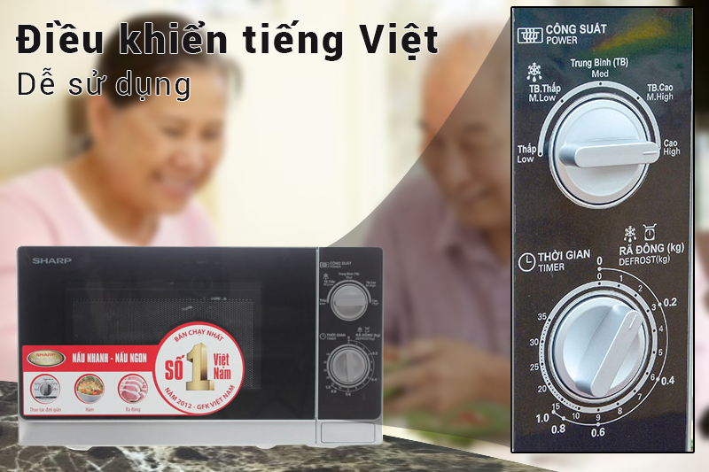 Cụm điều khiển vặn xoay có tiếng Việt chỉ dẫn trên từng nút, giúp hạn chế thao tác sai. Cho nên lò vi sóng Sharp R-205VN(S) hoàn toàn thân thiện với người sử dụng cho dù có là người lớn tuổi