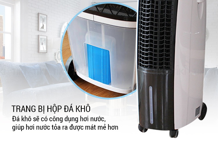 SUNTEK SL30 có ngăn để đá phía dưới sau quạt, khi mua quạt sẽ có thêm 1 hộp đá khô, đây là 1 loại đá hóa học, khi muốn làm lạnh thì cho hộp đá khô vào ngăn đá tủ lạnh (đá này có thể tái sử dụng), sau đó cho vào ngăn chứa đá của quạt, đá khô sẽ có công dụng hơi nước, giúp hơi nước tỏa ra được mát mẻ hơn.