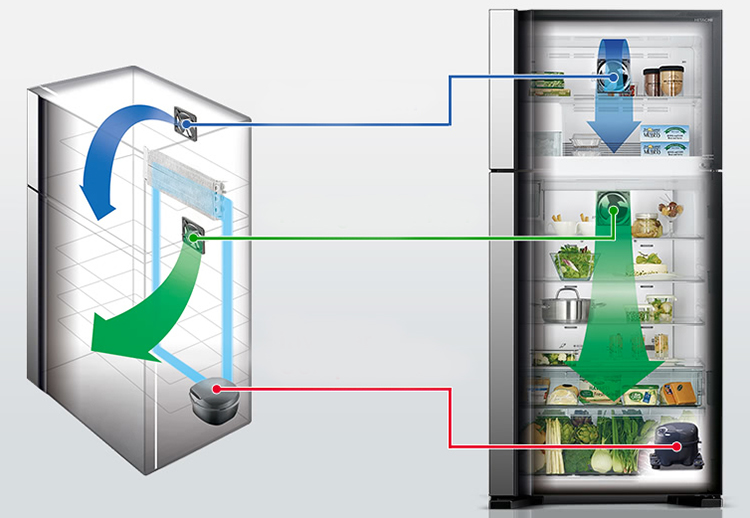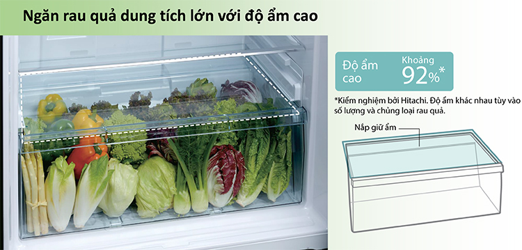 Đặc biêt, tủ lạnh Inverter Hitachi còn cung cấp độ ẩm tối ưu với lớp bảo vệ bên trên ngăn rau quả. Lớp bảo vệ bên trên ngăn sẽ không cho không khí lạnh thổi trực tiếp vào rau quả, giúp duy trì độ ẩm tối ưu bên trong ngăn. Bên cạnh đó, còn thiết kế hai ngăn trữ rau quả với dung tích lớn tiện lợi và khi chọn chế độ lưu trữ rau quả ở ngăn trữ chuyển đổi, bạn sẽ có hai ngăn rau quả với không gian lưu trữ tăng thêm đáng kể.