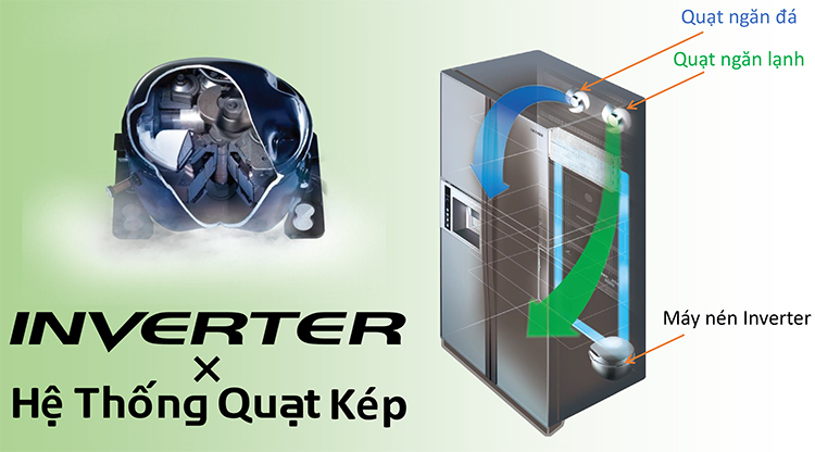 Tủ lạnh được trang bị công nghệ Inverter tiến tiến, giúp kiểm soát lượng khí đi đến từng ngăn, đảm bảo không có sự lãng phí điện năng và được xếp hạng tiết kiệm điện hàng đầu thế giới. Cùng với hệ thống quạt kép hiện đại giúp làm lạnh độc lập và hiệu quả cho cả hai ngăn (ngăn lạnh và ngăn đá). Hệ thống quạt kép cải tiến mới này sẽ mang đến hiệu quả tiết kiệm điện năng tốt hơn và làm lạnh cực mạnh, hỗ trợ bởi bộ đôi cảm biến nhiệt Eco được trang bị cho từng ngăn, giúp nhận biết sự thay đổi nhiệt độ tại mọi thời điểm.