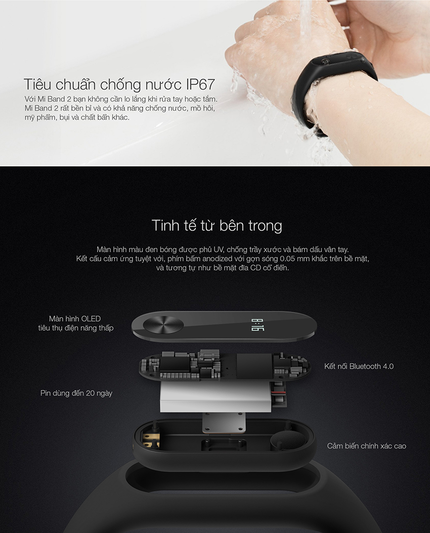 Miband 2 với thiết kế chống nước, chống bụi chuẩn IP67. Bạn có thể mang theo khi bơi lội mà không phải lo lắng gì. Chuẩn chống nước IP67 có nghĩa là miband 2 có khả năng chống bụi hoàn toàn và có thể chịu được 30 phút dưới nước với độ sâu 1m.